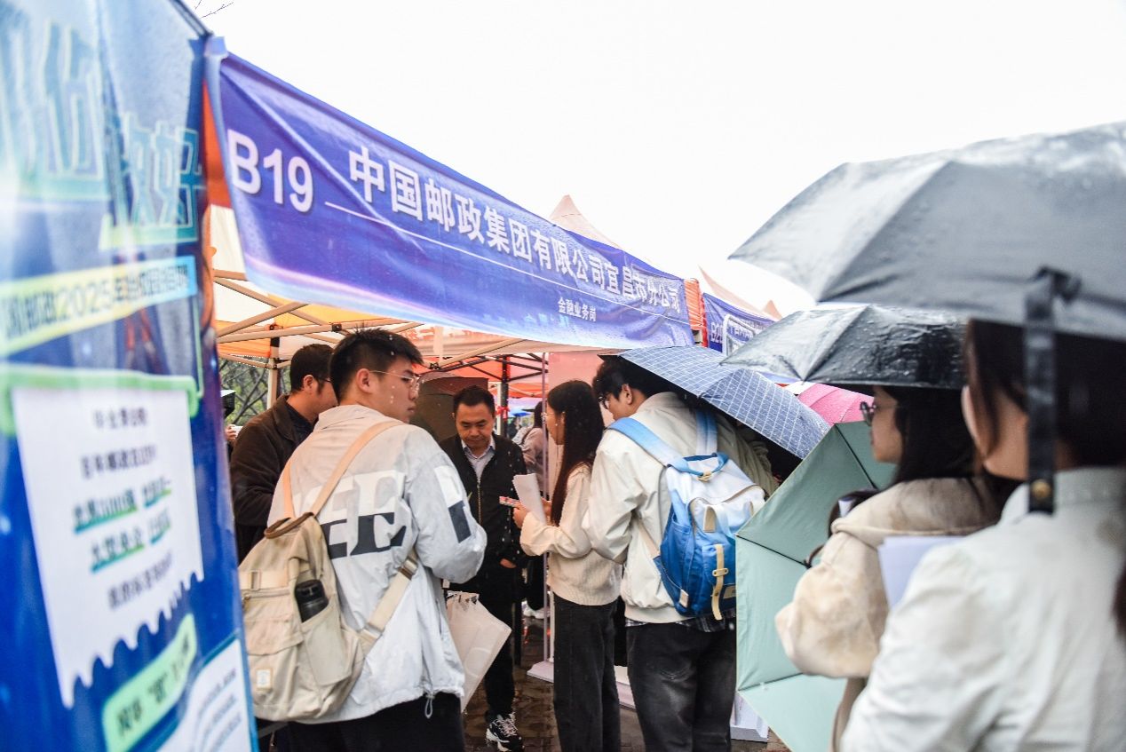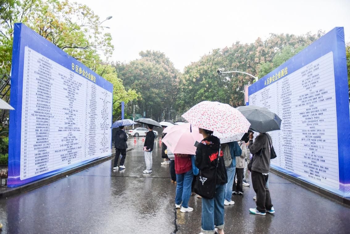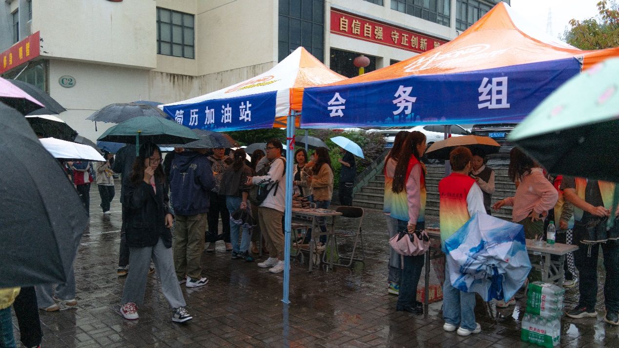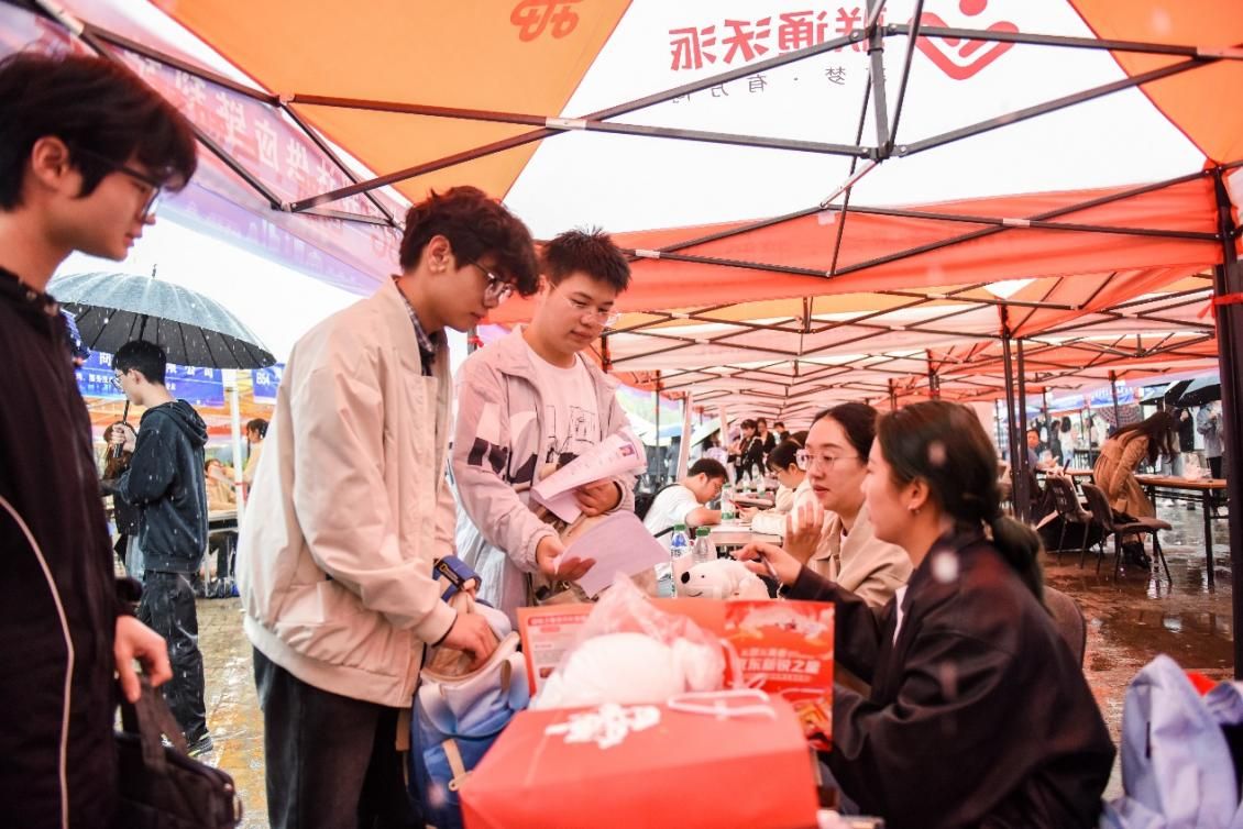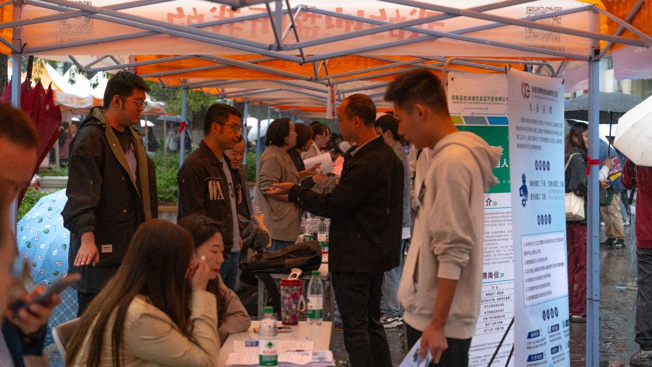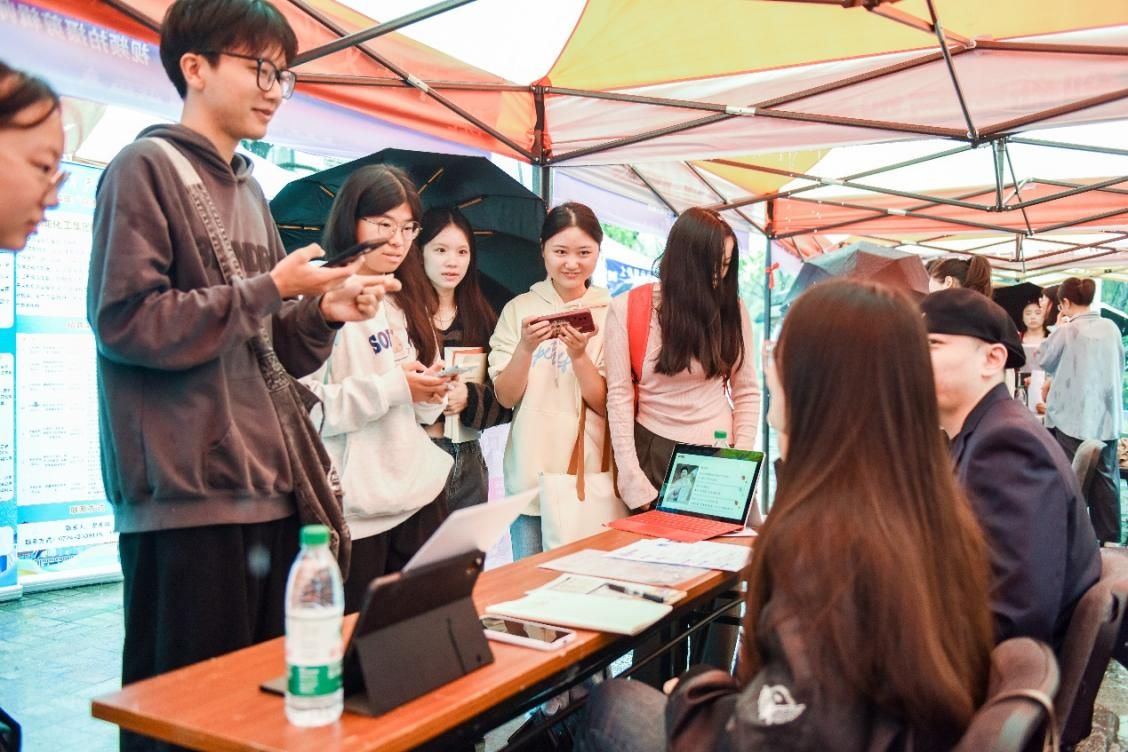 招聘会现场正下着大雨,但丝毫不影响同学们与用人单位的双向奔赴,一把把雨伞相互交织,穿梭在各个招聘场地。大学生发展及就业指导中心还特别设置了“简历加油站”,为学生求职应聘提供全链条指导服务。并在现场安排志愿者,为招聘单位和应聘学生提供及时有效的帮助。