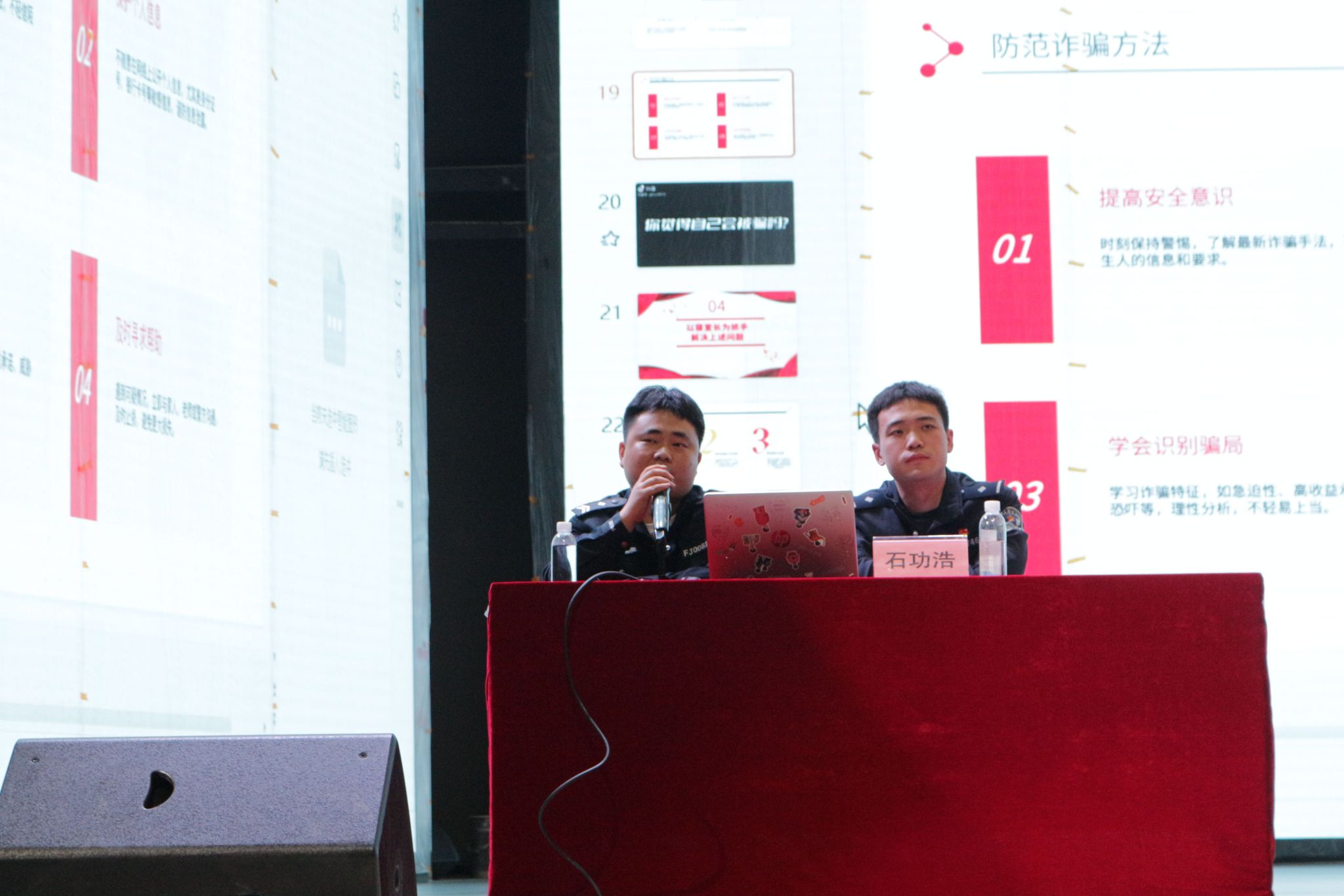 第一场由桥边派出所民警石功浩作报告,分别从防电信诈骗、防校园霸凌、大学生容易触犯的违法犯罪行为等方面,通过身边鲜活生动的相关案例、幽默风趣的警示视频做了讲解,甚至分享了自己险被诈骗的亲身经历告诫学生要时刻保持警惕、管好钱袋子,明晰校园霸凌行为和边界,了解参与校园霸凌、使用管制刀具的严重后果,提醒同学们要谨防校园霸凌、学会保护自己。