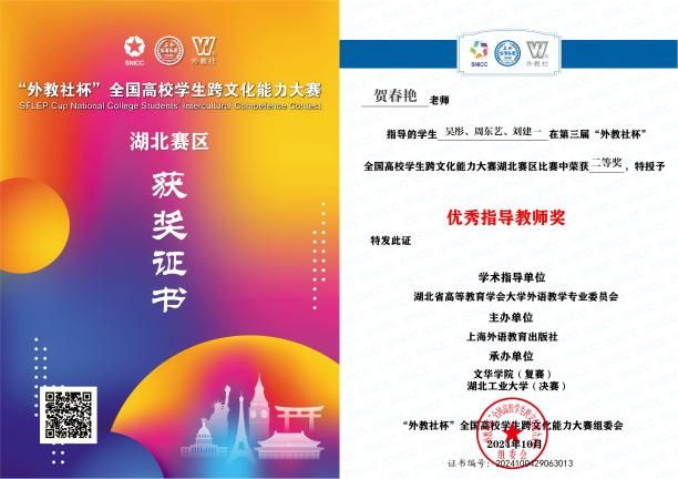 本网讯(通讯员 吴园园)10月中旬,第三届“外教社杯”湖北省高校学生跨文化能力大赛决赛在湖北工业大学圆满落幕,文法学部英语专业吴彤、刘建一、周东艺三名同学组成的参赛团队荣获湖北省二等奖。