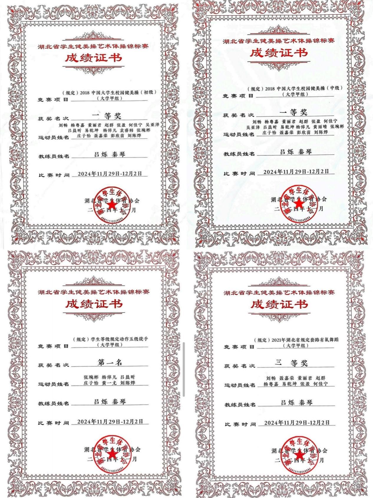 本网讯(通讯员 秦琴)2024年12月1日,2024湖北省学生健美操艺术体操锦标赛圆满落幕。我校18名学生在吕烁和秦琴两位老师的带领下,经过激烈的角逐四个项目分别获得了三个第一名和一个第三名的优异成绩。