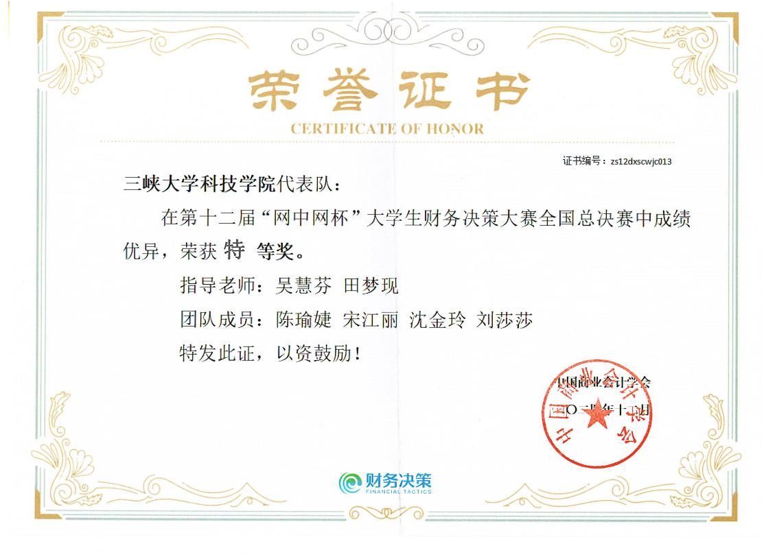 本网讯(通讯员 吴慧芬 田梦现)12月8日,由中国高等教育学会高等财经教育分会指导,中国商业会计学会主办,滇西应用技术大学承办的第十二届“网中网杯”大学生财务决策大赛全国总决赛在云南大理圆满收官。由经济管理学部教师吴慧芬、田梦现指导,2022级财务管理专业陈瑜婕、沈金玲,会计学专业宋江丽、刘莎莎四位同学组成的参赛队,在比赛中沉着应战,精诚协作,以全国第三的好成绩荣获全国总决赛特等奖,取得历史性突破,为学校争得荣誉。