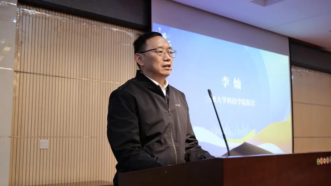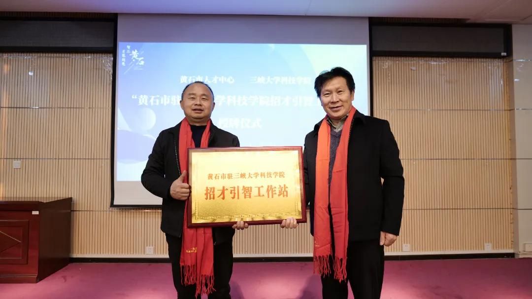 接下来,黄石市人才中心主任彭传意登台致辞,他诚挚感谢三峡大学科技学院的支持,热忱欢迎参与本次推介的大学生们。致辞中,彭主任指出黄石是兼具传统与现代魅力、充满活力且爱才的城市,并强调了人才重要性,介绍了黄石市的工业、生态和经济优势,对学子表达期许。彭传意主任随后代表黄石市向学院授予“黄石驻三峡大学科技学院招才引智工作站”牌匾,学院党委副书记欧阳美平代表学院接牌。