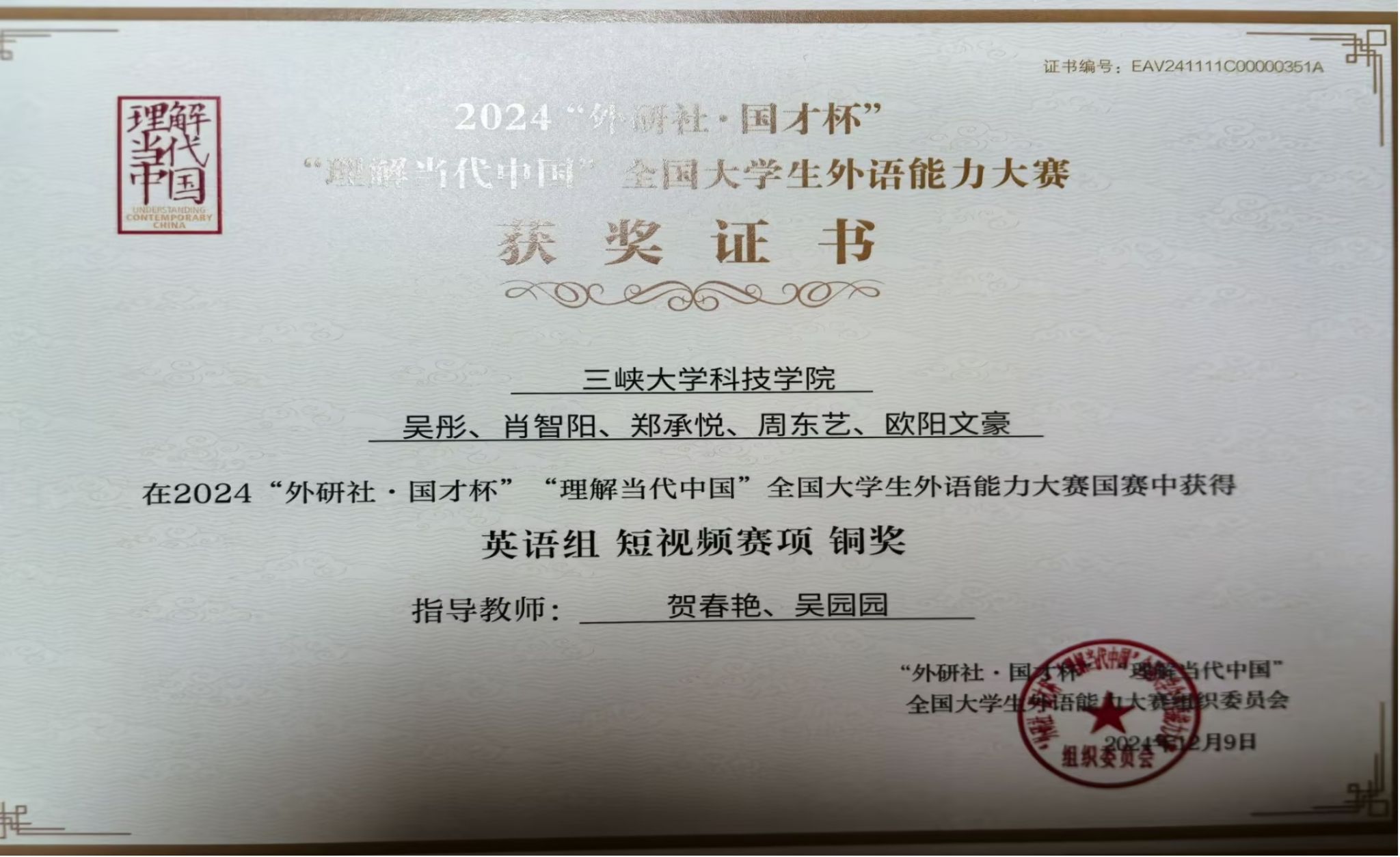 近日,在2024年“外研社·国才杯”“理解当代中国”短视频赛项(英语组)中,我院文法学部组建的两支参赛团队喜获佳绩。吴彤、郑承悦、肖智阳、周东艺、欧阳文豪五名同学的作品《数字时光机:连接三峡移民的过去与未来》荣获湖北省金奖和全国铜奖,取得了英语短视频赛事的历史性突破,宋江林、刘雅洁、周雅棋、章彩玥、吕正阳五名同学的作品《鱼翔江阔:科技守护未来》荣获湖北省银奖,展现了我院学子的卓越才华和创新精神。