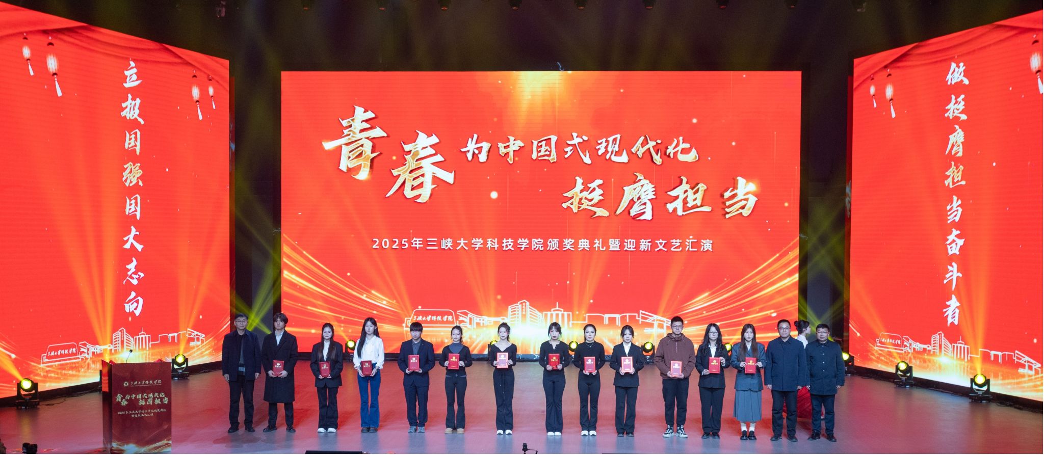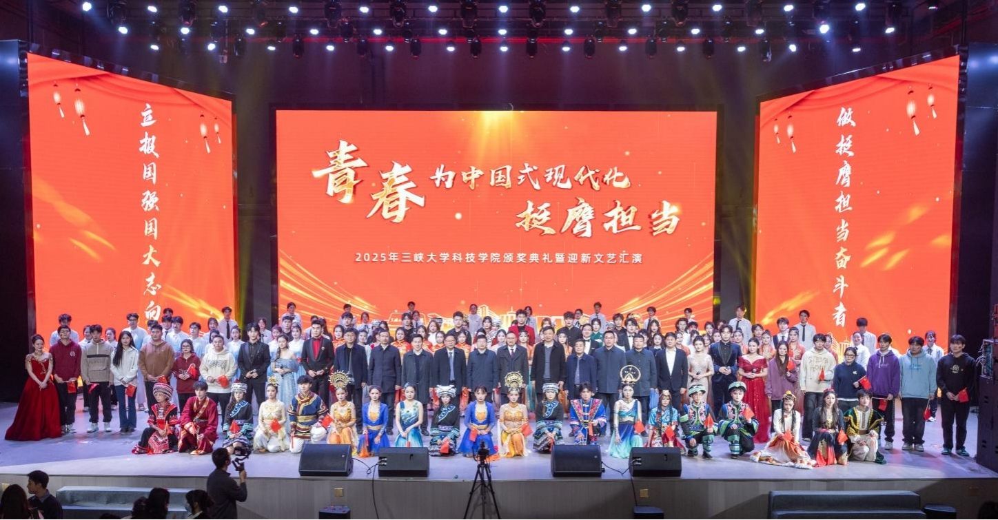 本网讯(通讯员 庞成宇/文 张袁/图)律转鸿钧,新元肇启。12月26日晚,2025年三峡大学科技学院“青春为中国式现代化挺膺担当”颁奖典礼暨迎新文艺汇演在新校区学术交流中心隆重举行。青春是梦想的摇篮,是奋斗的舞台,为进一步丰富校园文化生活,彰显青春活力,号召全院师生“立报国强国大志向,做挺膺担当奋斗者”,特此呈现本场“思政+美育”文艺盛宴。本活动特邀三峡大学党委常委张成同志出席,学院领导班子以及师生代表近千余人来到活动现场,一万余人通过学院官媒直播平台线上一起共度这一美好时刻。