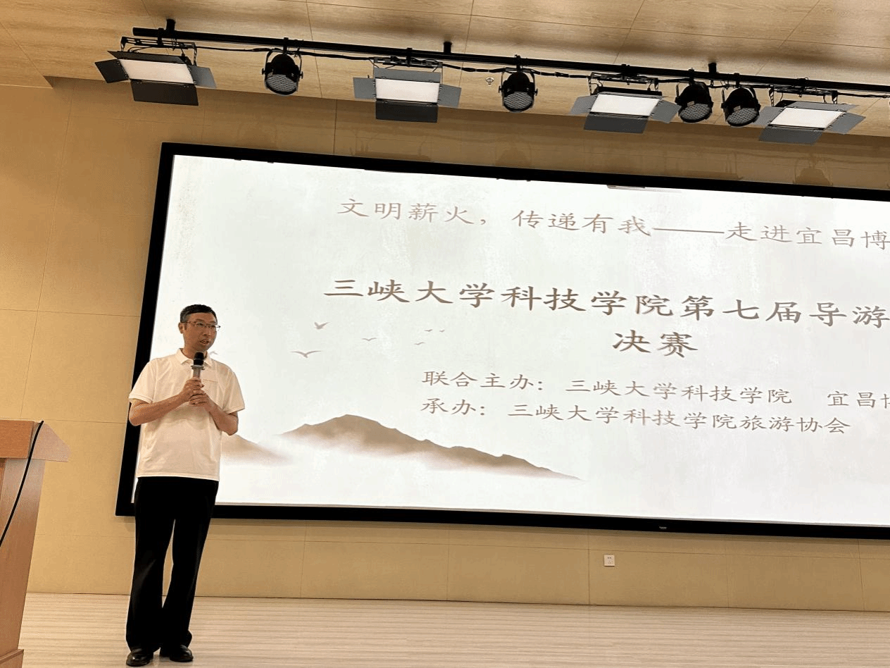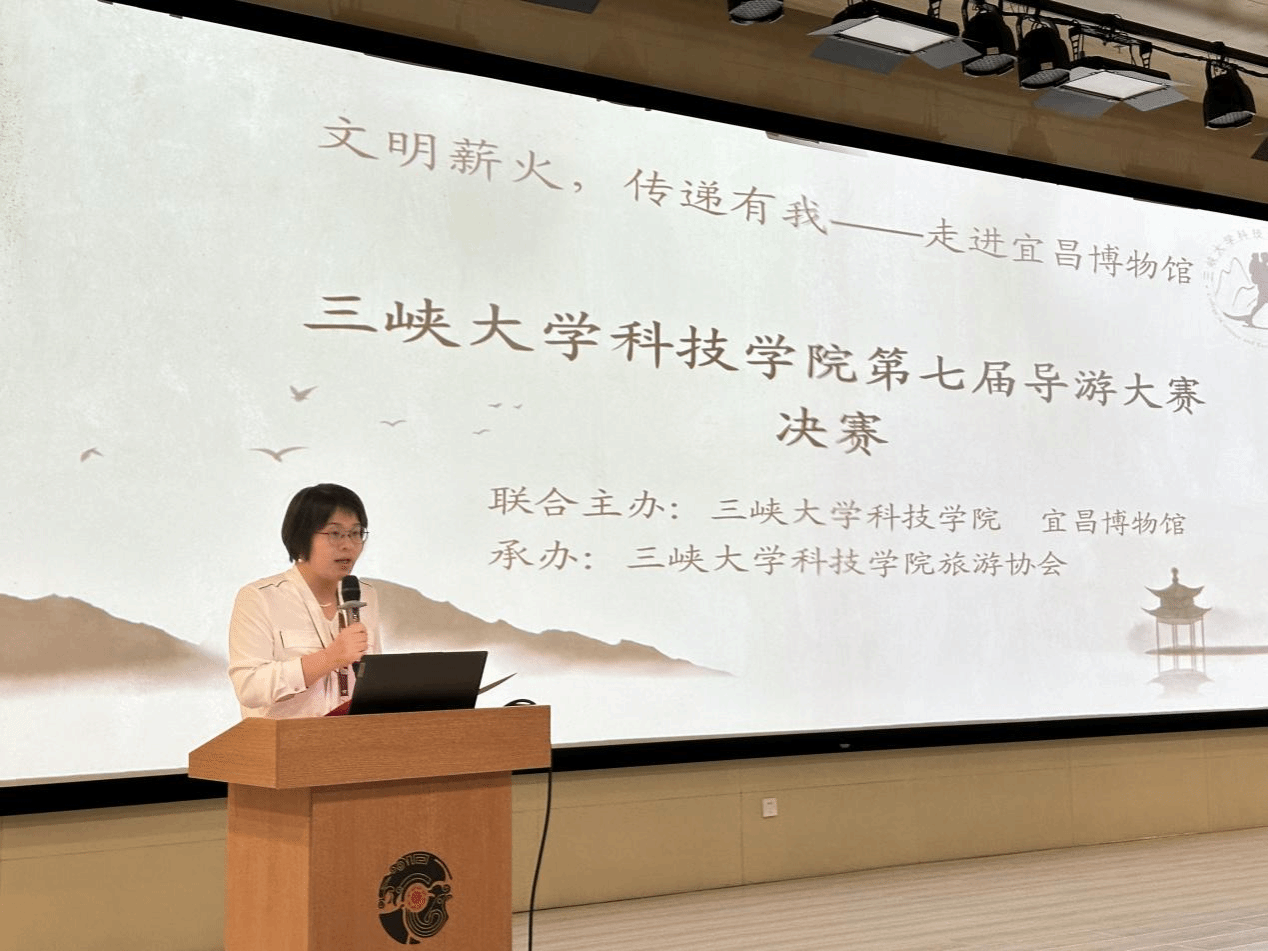 本网讯(通讯员 牟晓娟、许静)2025年4月28日下午,以“文明薪火,传递有我——走进宜昌博物馆”为主题的第七届三峡大学科技学院导游大赛在宜昌博物馆落下帷幕,学院副院长罗华军、宜昌博物馆副馆长董清丽出席决赛现场并致辞。
