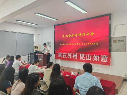 昆山市人力资源管理服务中心副主任钟臻弘对昆山市市情进行推介,他介绍了昆山市的发展历程、未来发展方向以及引才留才政策,表达了昆山市对人才的渴望,希望学院学子们能了解昆山、选择昆山,能有更多的学生到昆山生活、工作,在昆山发光发热。