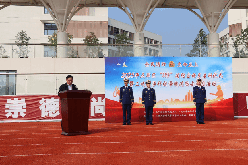 (通讯员 李莉)11月9日第34个全国消防日将至,为广泛普及消防安全知识,切实增强全校师生的消防意识与自救互救能力。11月5日上午,学生工作部联合点军区消防救援大队在新校区举行了2025年点军区119消防宣传月启动仪式暨三峡大学科技学院消防安全月活动。学院党委书记田强、宜昌市消防救援支队副政委周正桃、区消防救援大队大队长宋风及教导员梁健、新校区全体学工人员、全体物业人员、学生代表1500余人参加了此次活动。