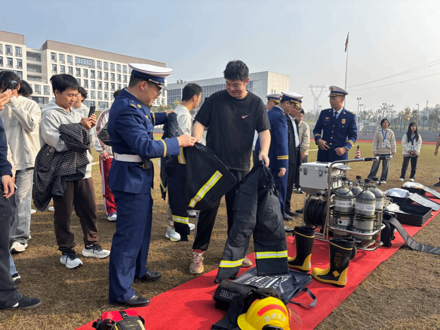 致辞环节后,进入到形式多样的 “实操体验” 与 “趣味互动” 阶段。机械电气学部和文法学部师生率先进入灭火器教学区,在消防员手把手指导下学习实践 “提拔握压” 的灭火技巧;土木水电学部、生化医学部及经济管理学部师生则在装备展示区,认真聆听消防员讲解各类破拆灭火设备的工作原理与使用场景,近距离观察并试穿消防服、体验使用破拆工具等专业设备。随后有序交换场地,确保每位师生都能深度参与两项体验,将理论知识转化为实操能力。