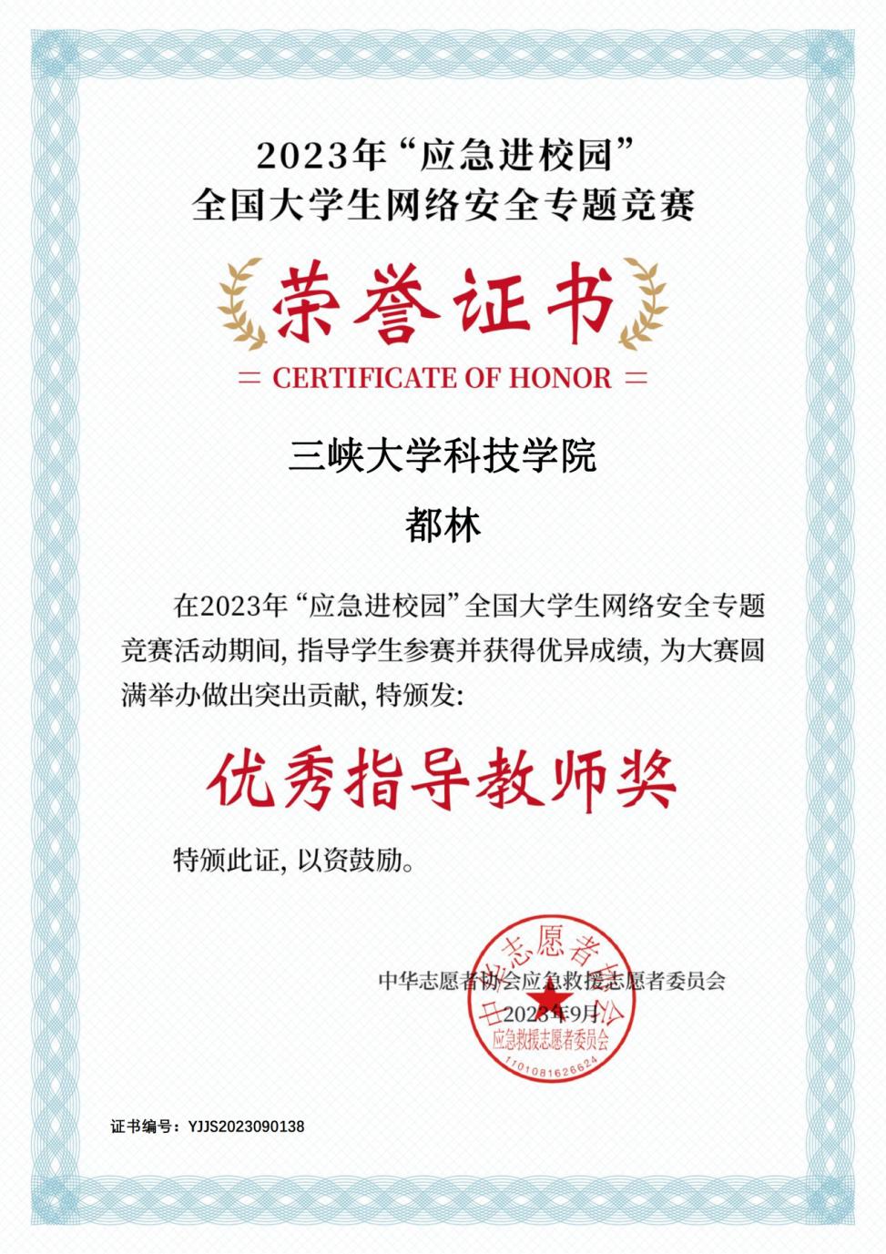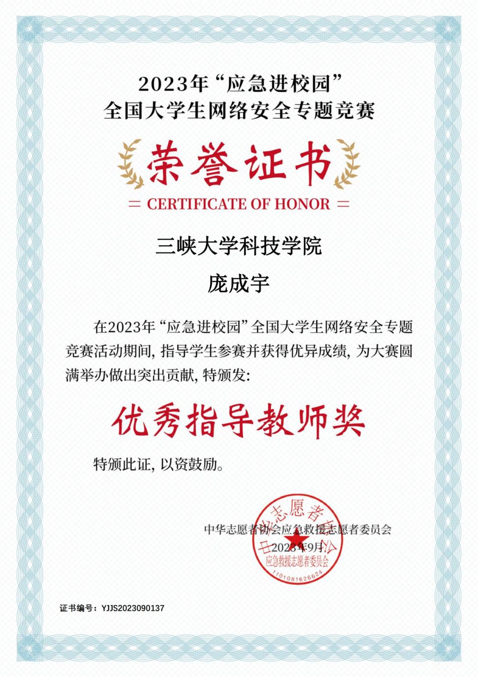 本网讯(通讯员 庞成宇)为加强大学生网络安全防范意识,由中华志愿者协会应急救援志愿者委员会举办20余所高校参加的2023年“应急进校园”全国大学生网络安全专题竞赛顺利落下帷幕。本次网络安全专题竞赛三峡大学科技学院青年志愿者服务队协助举办,我院137人参加比赛并收获颇丰。党委副书记欧阳美平、院长助理兼学生工作部部长都林、团委书记庞成宇,在这次活动期间积极指导学生参赛并获得优异成绩,为大赛圆满举办做出了突出贡献,荣获“优秀指导教师奖”。