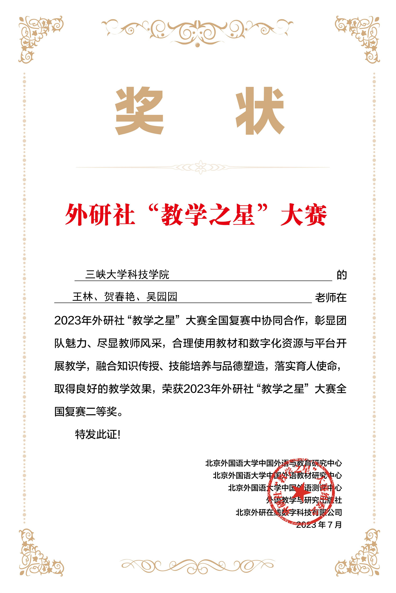 本网讯(通讯员 王林 贺春艳 吴园园) 在2023年外研社“教学之星”大赛中,我院文法学部王林、贺春艳、吴园园三位老师组成的教师团队喜获全国复赛二等奖。