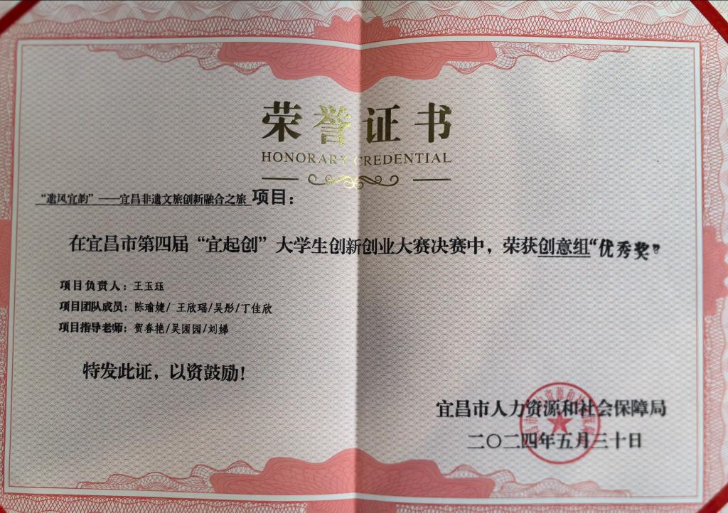 本网讯(通讯员 贺春艳/文/图)2024年5月30日,三峡大学科技学院文法学部师生打造的项目:“遗风宜韵”—宜昌非遗文旅创新融合之旅,从全国200多个项目中脱颖而出,进入了由宜昌市人力资源和社会保障局举办的第六届“中国创翼”湖北省项目选拔暨宜昌市第四届“宜起创”大学生创新创业大赛决赛,最终获得创意组“优秀奖”。