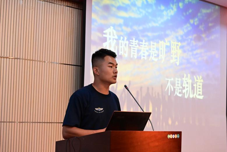 大会第四项,我院2016 级制药工程学生,优秀退伍学生、助力乡村振兴代表王皝学长发言。王皝现任点军区关爱退役军人协会·军创分会秘书长,点军区青年联合会委员,神农架文旅推荐官,湖北耘蓬农业生物科技有限公司总经理。曾获部队嘉奖、湖北省自强之星,宜昌市五四青年奖章等各级各类荣誉。他结合自身经历向同学们分享了军旅生涯、心路历程,介绍了多彩的部队生活、丰厚的薪酬待遇、军人职业发展规划等方面的内容,在场学生通过优秀学长的现身说法对中国军人有了更直观更全面的了解,愈加坚定了参军报国的理想信念。最后王皝学长号召同学们投身火热军营,在熔炉里锤炼男儿本色,在军营里实现人生理想。
