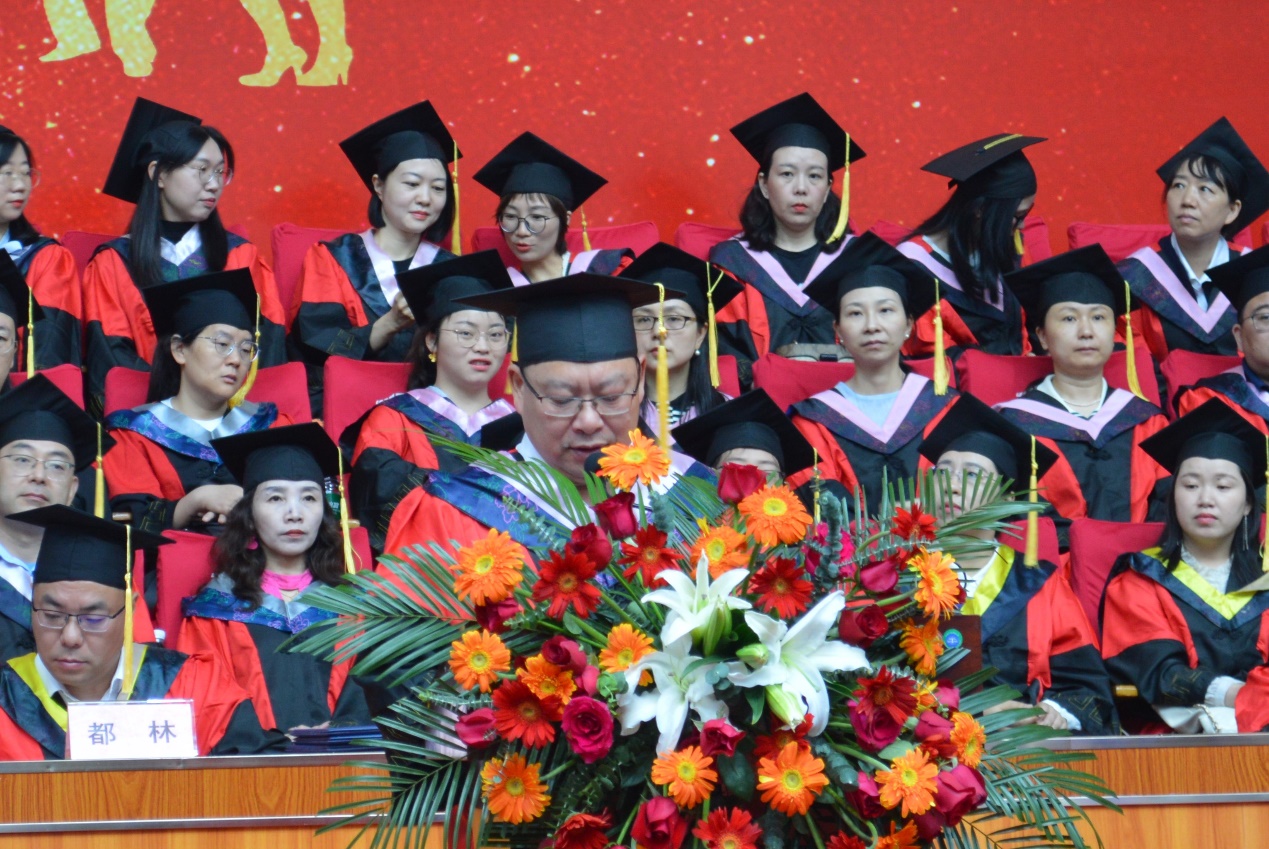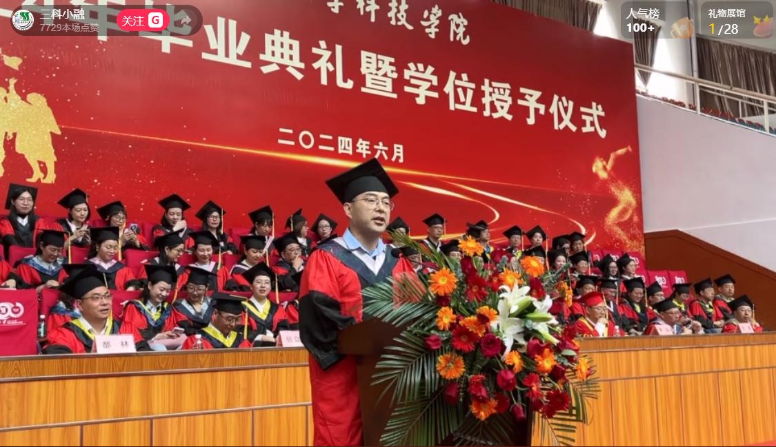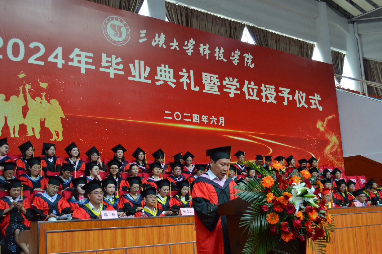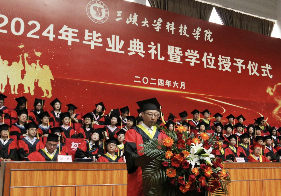 仪式最后,三峡大学科技学院院长李灿致辞。借着这堂“毕业思政课”,李灿从“共赴新程,一马当先”“开拓探索,敢于创新”“凝聚力量,贡献自我”三个方面寄予毕业生谆谆嘱托:“希望全体毕业生追光而遇、沐光而行、砥砺前行,一路生花,你们的成长和进步,不仅是学校的荣誉,更是学校的骄傲。”发言最后,李灿表达了对全体毕业生的祝福:“母校永远是你们坚强的后盾和温暖的港湾。无论你们走到哪里、身处何方,母校都会关注着你们的成长和发展。希望你们常回家看看,与母校共享成功的喜悦和荣耀!”
