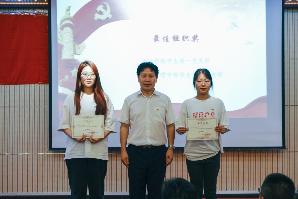 会议第三项,由党委副书记欧阳美平同志宣读《三峡大学科技学院2024年党内评优评先》表彰决定,并由在场领导为获奖党员颁奖,希望在场的预备党员向优秀党员看齐,积极学习身边榜样,勇于承担使命责任,不断奉献。
