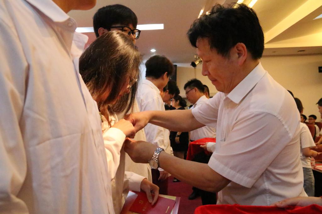宣誓仪式结束后,正式党员为新党员佩戴党徽并赠送政治生日贺卡及党章,象征将党员的责任与使命薪火相传,引导新党员增强党员意识。李青铎同志代表此次宣誓的预备党员发言,他表示作为新党员的代表,今后会时刻牢记党的宗旨,坚定理想信念,发挥好学生党员的桥梁纽带作用,更好地为同学们服务。