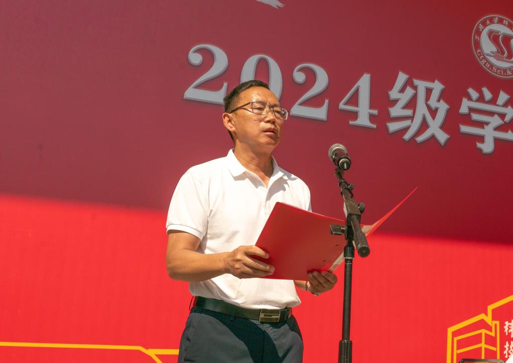 在开学典礼环节中,院长李灿首先代表全院师生对2024级新生的到来表示欢迎,并做开学讲话,他对新生寄予厚望,强调“考上大学是人生走向社会的第一个重要平台和起点。在新的环境,你们一定要勇于挑战自我,勇于拼搏,拿出“吹尽狂沙始到金”的毅力,用“直挂云帆济沧海”的勇气,去迎接人生中的风风雨雨!”