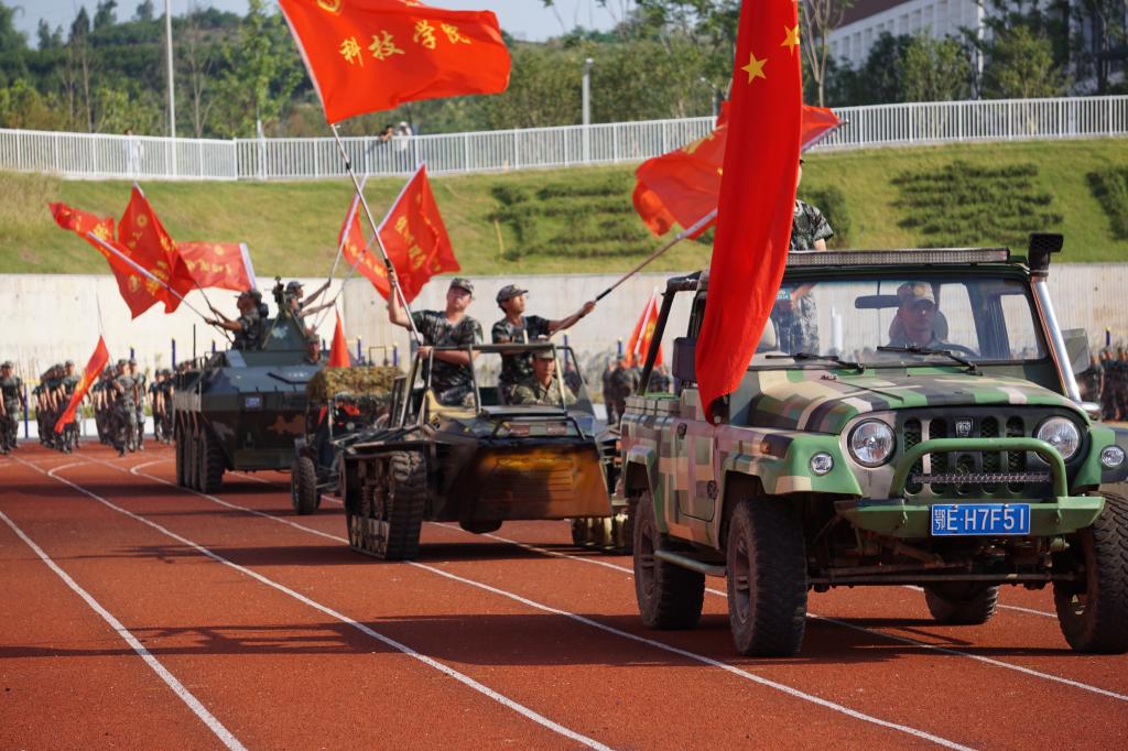 上午九点,活动拉开序幕,全体师生共迎国旗,行注目礼并奏唱中华人民共和国国歌。随着九发震天响的迫击炮、火箭筒和定向筒的发射,军训汇演正式开始,院长李灿和点军区人武部上校部长祁承荣共同检阅了军训队伍。随后六发迫击炮、火箭筒以及定向筒腾空而起,高空彩烟升起,伴随音乐重型装备,坦克,装甲车依次亮相,气势恢宏。