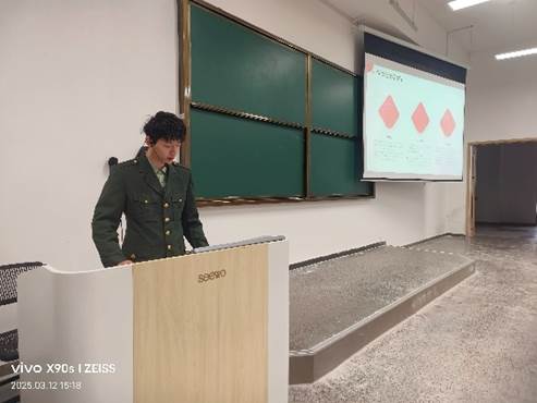 为了让同学们更清晰地了解征兵政策,陈永杰同学进行了详细解读。他围绕征兵条件、报名流程、优待政策等方面展开,用通俗易懂的语言和具体案例,解答了同学们关心的问题。他特别提到,国家出台了一系列优厚政策,鼓励大学生参军入伍,在学业资助、就业创业等方面给予大力支持,消除同学们的后顾之忧。现场气氛十分活跃。