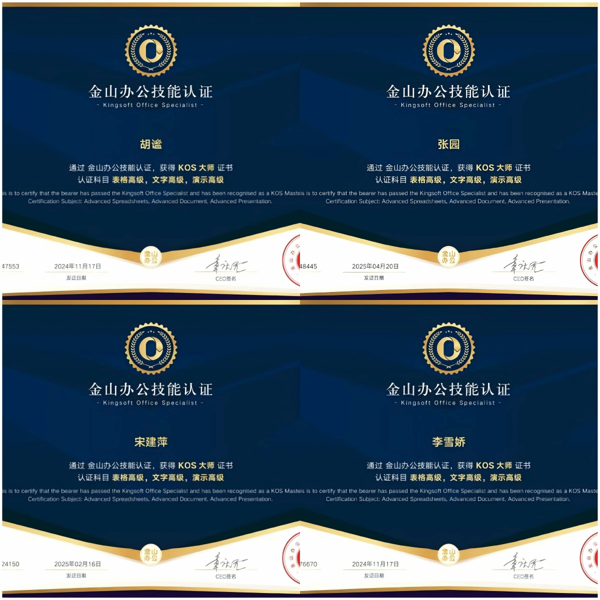 办公技能大师级认证是金山公司推出的官方办公技能认证平台,涵盖“学、练、考、评”一体化流程,旨在提升职场人士办公效率,助力企业人才培养。大师级认证要求被认证者同时通过WPS文字高级、WPS表格高级和WPS演示高级三项考试,难度较高,含金量十足。五位教师利用业余时间刻苦钻研,最终全部通过考核,展现了机电教师的责任担当和专业素养。