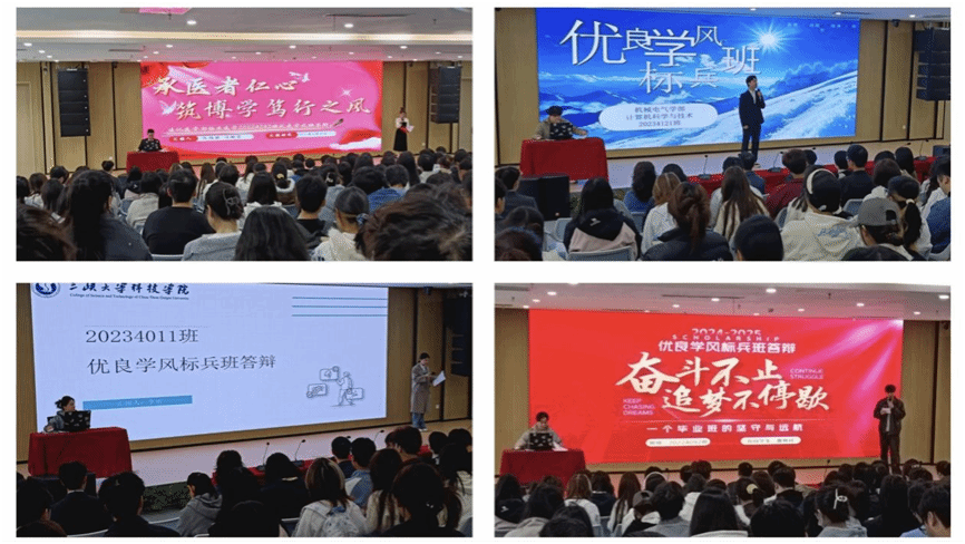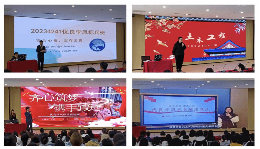 各学部推选出15个参评班级按序登场,紧扣“崇德、尚能、修身、明智”校训,以数据展实绩、以故事显班风,答辩现场气氛热烈,各班级结合专业特色亮出学风建设的“成绩单”,亮点纷呈又各具韵味。有的班级深耕专业根基,积极参加各类竞赛,以过硬成绩彰显实力;有的班级凭借实干作风,将理论运用到实践中,踏实务实,体现出“一分耕耘,一分收获”;还有的班级彰显班级凝聚力,成立“一对一”帮扶小组,让同学们提高学习效率,以集体智慧铺就成长阶梯。整场答辩所展示的数据详实、案例鲜活,充分展现了各班级在学风建设中的责任担当与青春风采。